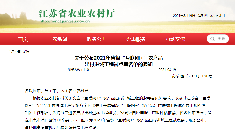 各設區(qū)市、縣(市、區(qū))農業(yè)農村局:根據(jù)農業(yè)農村部《關于實施“互聯(lián)網+”農產品出村進城工程的指導意見》要求,以及《江蘇省“互聯(lián)網+”農產品出村進城工程實施方案》《......