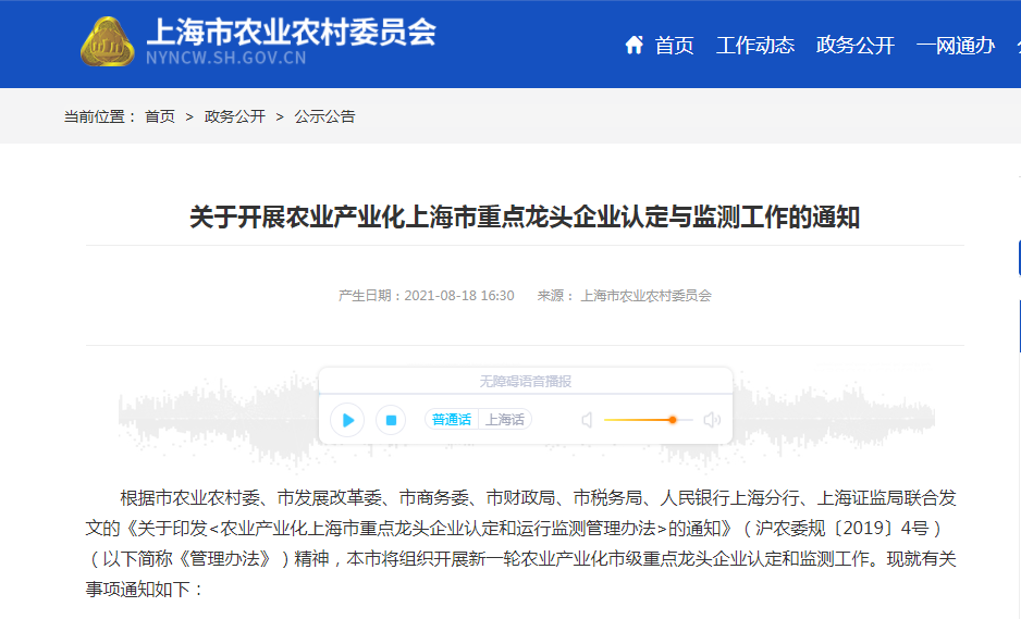 根據(jù)市農業(yè)農村委、市發(fā)展改革委、市商務委、市財政局、市稅務局、人民銀行上海分行、上海證監(jiān)局聯(lián)合發(fā)文的《關于印發(fā)<農業(yè)產業(yè)化上海市重點龍頭企業(yè)認定和運行監(jiān)測......