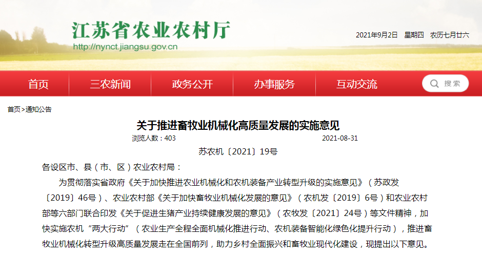各設區(qū)市、縣(市、區(qū))農業(yè)農村局:為貫徹落實省政府《關于加快推進農業(yè)機械化和農機裝備產業(yè)轉型升級的實施意見》(蘇政發(fā)〔2019〕46號)、農業(yè)農村部《關于加快畜......