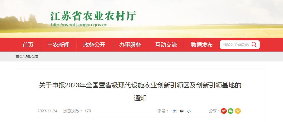 各設區(qū)市農業(yè)農村局:根據(jù)《農業(yè)農村部辦公廳關于開展2023年全國現(xiàn)代設施農業(yè)創(chuàng)新引領區(qū)及創(chuàng)新引領基地遴選工作的通知》《江蘇省現(xiàn)代設施農業(yè)建設引領示范行動實施方案......
