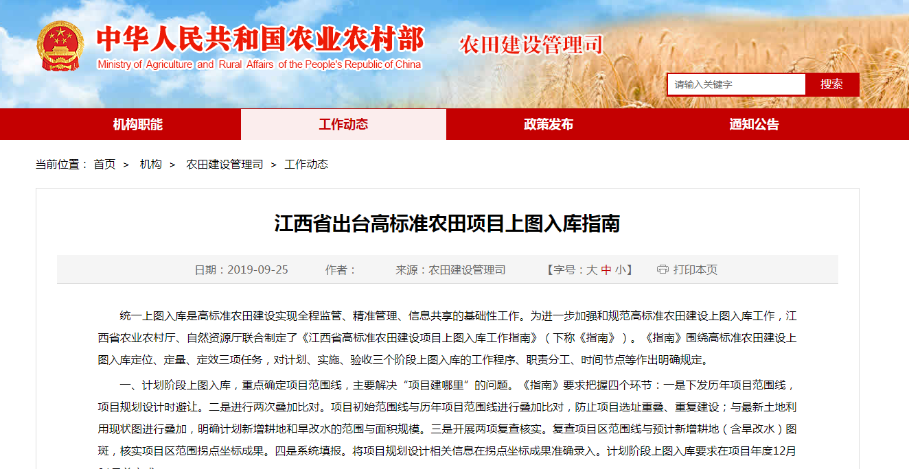 統(tǒng)一上圖入庫是高標(biāo)準(zhǔn)農(nóng)田建設(shè)實(shí)現(xiàn)全程監(jiān)管、精準(zhǔn)管理、信息共享的基礎(chǔ)性工作。為進(jìn)一步加強(qiáng)和規(guī)范高標(biāo)準(zhǔn)農(nóng)田建設(shè)上圖入庫工作,江西省農(nóng)業(yè)農(nóng)村廳、自然資源廳聯(lián)合制定了《......
