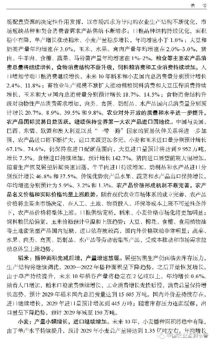 稻谷、小麥、玉米是中國(guó)三大谷物,《報(bào)告》顯示,未來(lái)10年,中國(guó)谷物生產(chǎn)平穩(wěn)向好,消費(fèi)持續(xù)逐步提升,口糧供給充足。得益于科技進(jìn)步、單產(chǎn)提高,稻谷產(chǎn)量將穩(wěn)定在2億噸以上,優(yōu)質(zhì)稻谷播種面積將增加,小麥產(chǎn)量將達(dá)到13500萬(wàn)噸,玉米產(chǎn)量將達(dá)到3.38億噸。