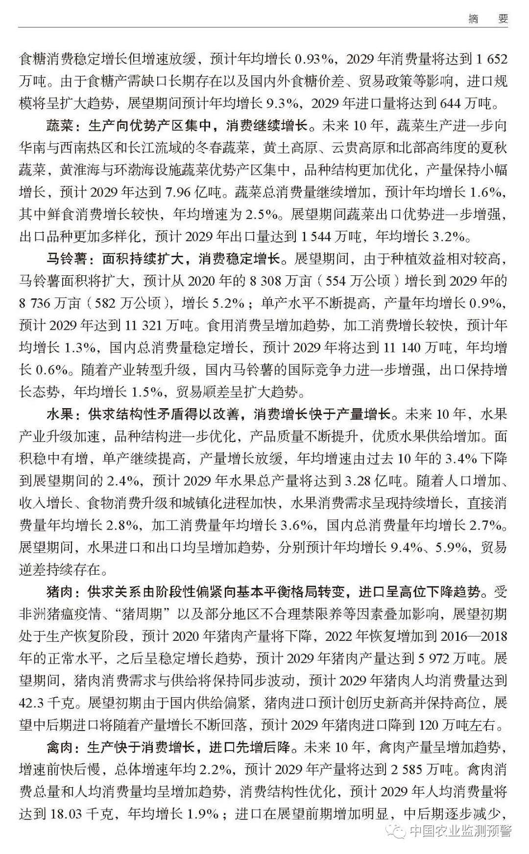 《報(bào)告》顯示,我國(guó)蔬菜生產(chǎn)量占世界50%以上,2019年達(dá)到71889萬(wàn)噸,消費(fèi)量?jī)H為53245萬(wàn)噸,完全可以自給。未來(lái)10年,得益于技術(shù)進(jìn)步產(chǎn)量還將提升,但生產(chǎn)目標(biāo)將發(fā)生轉(zhuǎn)變。農(nóng)業(yè)農(nóng)村部市場(chǎng)預(yù)警專家委員會(huì)副主任、市場(chǎng)與信息化司司長(zhǎng)唐珂介紹,我國(guó)蔬菜生產(chǎn)將在安全性、生態(tài)型、標(biāo)準(zhǔn)化、規(guī)?;?、設(shè)施化等方面進(jìn)一步增強(qiáng),食用農(nóng)產(chǎn)品合格證制度將在全國(guó)試行,并將大力推動(dòng)蔬菜生產(chǎn)綠色發(fā)展,名特優(yōu)新蔬菜的需求會(huì)明顯增加。同理,作為水果大國(guó),未來(lái)十年,我國(guó)水果生產(chǎn)也將進(jìn)一步向優(yōu)勢(shì)產(chǎn)區(qū)集中,品種結(jié)構(gòu)進(jìn)一步優(yōu)化,果品質(zhì)量得到提升。