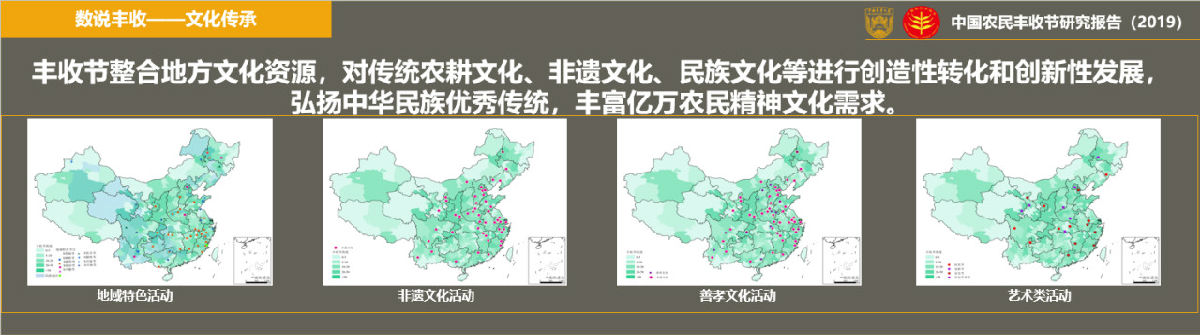 《報(bào)告》指出各地活動(dòng)重心下沉到縣鄉(xiāng)村,以各地農(nóng)時(shí)農(nóng)事特點(diǎn)、優(yōu)秀傳統(tǒng)文化開(kāi)展喜聞樂(lè)見(jiàn)的特色活動(dòng),為響應(yīng)組織指導(dǎo)委員會(huì)開(kāi)展的“6個(gè)千萬(wàn)”鄉(xiāng)村振興系列活動(dòng),各地組織了文藝表演和主題匯演類(lèi)、農(nóng)耕文化和農(nóng)事體驗(yàn)類(lèi)、鄉(xiāng)村美食品鑒和評(píng)選類(lèi)、傳統(tǒng)農(nóng)業(yè)節(jié)慶和產(chǎn)業(yè)節(jié)慶類(lèi)、優(yōu)質(zhì)農(nóng)產(chǎn)品展銷(xiāo)和推介類(lèi)、代表人物和特色產(chǎn)品評(píng)選類(lèi)等系列活動(dòng)。