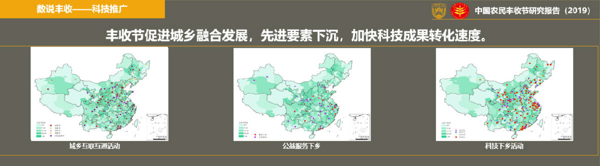 報(bào)告》指出各地舉辦中國(guó)農(nóng)民豐收節(jié),活動(dòng)形式和展示對(duì)象多種多樣,融合了傳統(tǒng)文化傳承、農(nóng)事體驗(yàn)、農(nóng)產(chǎn)品展示、農(nóng)業(yè)旅游等元素,在此基礎(chǔ)上,各地還組織了會(huì)議論壇、科技宣傳、推介簽約等新的活動(dòng),通過(guò)與新媒體平臺(tái)跨界合作,強(qiáng)化地方農(nóng)產(chǎn)品品牌,促進(jìn)農(nóng)產(chǎn)品產(chǎn)銷(xiāo)對(duì)接;促使先進(jìn)要素下沉,加快了科技成果轉(zhuǎn)化速度,整體推動(dòng)城鄉(xiāng)融合發(fā)展。
