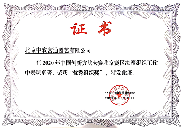 ▼10月19日,2020年中國創(chuàng)新方法大賽北京賽區(qū)決賽舉辦,北京中農(nóng)富通園藝有限公司和北京中農(nóng)天陸微納米氣泡水科技有限公司獲比賽優(yōu)秀組織獎。