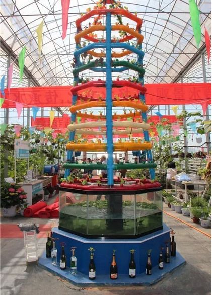 中國(guó)農(nóng)業(yè)大學(xué)富通公司設(shè)計(jì)的魚(yú)菜共生系統(tǒng)創(chuàng)造性的將微納米氣泡技術(shù)與魚(yú)菜循環(huán)系統(tǒng)完美結(jié)合,通過(guò)自主研發(fā)的微納米氣泡水發(fā)生裝置把氣體(如:空氣、氧氣、臭氧等)用高速旋回切割方式溶入水中,快速、高效地制取微納米氣泡水,提高氣體在水體中的溶解效率,為魚(yú)類(lèi)提供充足的氧氣,同時(shí)通過(guò)循環(huán)系統(tǒng)將微納米氣泡水運(yùn)送至植物根系,有效提高植物根系含氧量,促進(jìn)植物生長(zhǎng)。