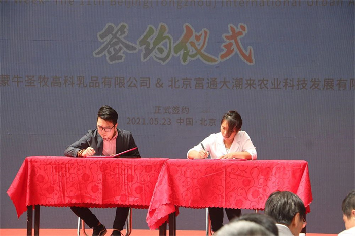 內(nèi)蒙古蒙牛圣牧高科乳品有限公司、北京明興旭豐產(chǎn)銷專業(yè)合作社、河北一航新能源科技有限公司分別與北京富通大潮來農(nóng)業(yè)科技發(fā)展有限公司簽署合作協(xié)議。