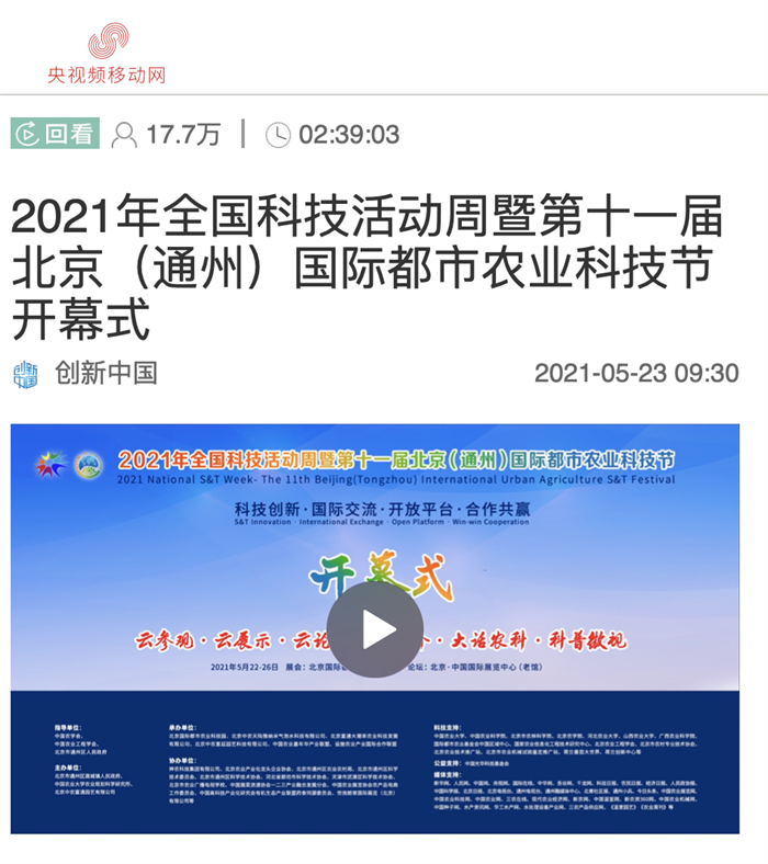當(dāng)前,我國已開啟全面建設(shè)社會(huì)主義現(xiàn)代化國家新征程,“三農(nóng)”工作轉(zhuǎn)入全面推進(jìn)鄉(xiāng)村振興、加快農(nóng)業(yè)農(nóng)村現(xiàn)代化新階段。為進(jìn)一步促進(jìn)科技創(chuàng)新在農(nóng)業(yè)農(nóng)村領(lǐng)域的應(yīng)用,加強(qiáng)現(xiàn)代農(nóng)業(yè)產(chǎn)業(yè)技術(shù)體系建設(shè),加快科研成果轉(zhuǎn)化推廣,推進(jìn)新思維、新理念、新業(yè)態(tài)、新模式、新技術(shù)、新設(shè)施、新設(shè)備、新品種落地,增強(qiáng)科技對(duì)都市農(nóng)業(yè)的服務(wù)功能,5月23日上午,2021年全國科技活動(dòng)周暨第十一屆北京(通州)國際都市農(nóng)業(yè)科技節(jié)”(以下簡稱科技節(jié))在北京國際都市農(nóng)業(yè)科技園隆重開幕!