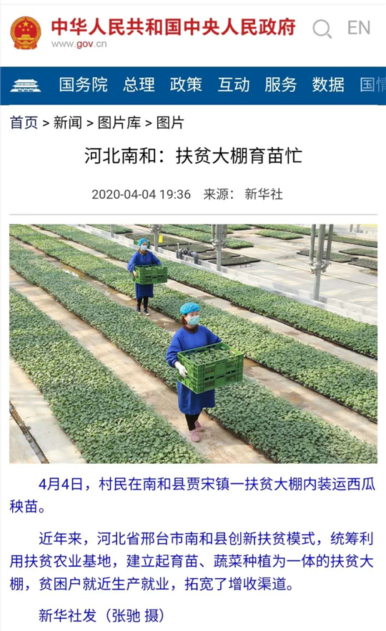 ▼4月4日,中國(guó)政府網(wǎng)報(bào)道了中國(guó)南和設(shè)施農(nóng)業(yè)產(chǎn)業(yè)集群育苗、蔬菜種植為一體的扶貧模式,為貧困戶就近生產(chǎn)就業(yè),拓寬了增收渠道。(新華社發(fā) 張馳 攝)