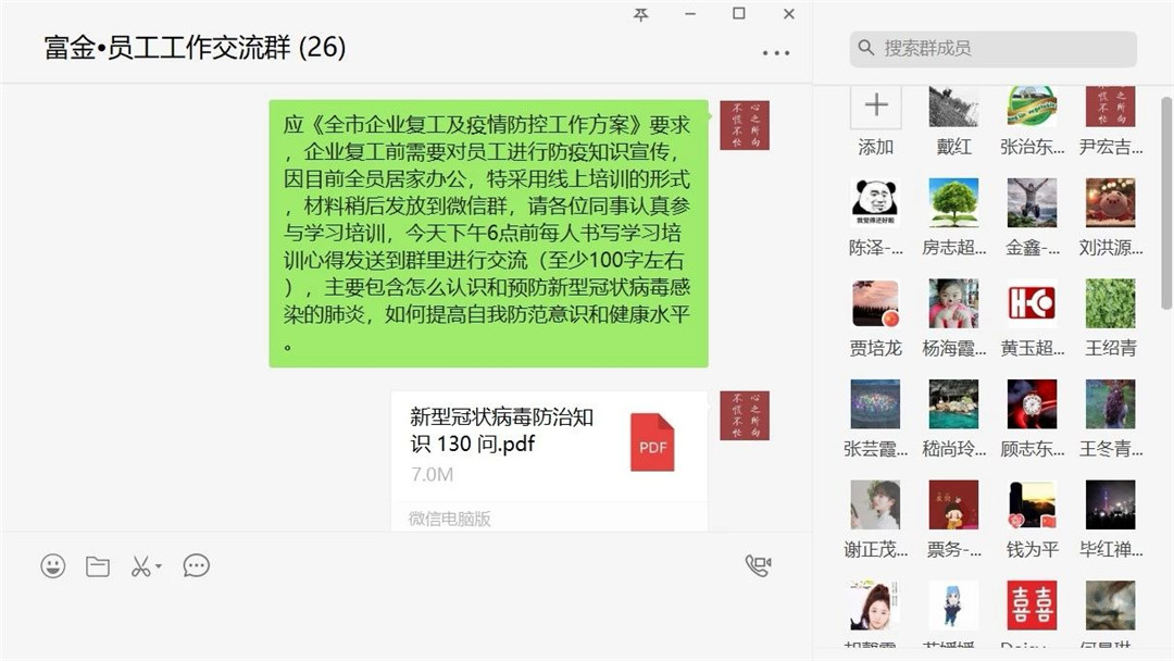 ▼金湖水漾年華積極響應(yīng)政府號召,嚴(yán)格執(zhí)行落實《全市企業(yè)復(fù)工及疫情防控工作方案》,抓緊抓實疫情防控工作不松勁。要求全體員工居家線上辦公,每日報備身體狀況。并通過微信群的形式開展防疫知識培訓(xùn)學(xué)習(xí),收集有關(guān)安全防疫的文件及視頻,培訓(xùn)后員工在微信群內(nèi)交流心得。園區(qū)成立疫情防控小組,每人都派發(fā)消毒水、口罩、手套,和一定數(shù)量的體溫計等物資,每天對園區(qū)進(jìn)行全面消毒,嚴(yán)防死守,復(fù)工前全面做好園區(qū)環(huán)境衛(wèi)生和消毒工作,有序推進(jìn)園區(qū)復(fù)工準(zhǔn)備工作。
