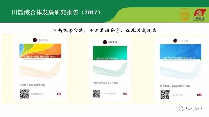基于此,中國農業(yè)大學農業(yè)規(guī)劃科學研究所成立了“田園綜合體發(fā)展研究課題組”經過一年的研究,將近年來的經驗教訓及各地的創(chuàng)建內容編著成冊,供學界、企業(yè)界和新農民們參考討論。也希望提供一個了解田園綜合體發(fā)展理論和實踐研究進展的窗口,為各級政府制定田園綜合體具體發(fā)展戰(zhàn)略、持續(xù)健康發(fā)展提供參考,為地方政府或企業(yè)進行田園綜合體的開發(fā)建設提供借鑒。