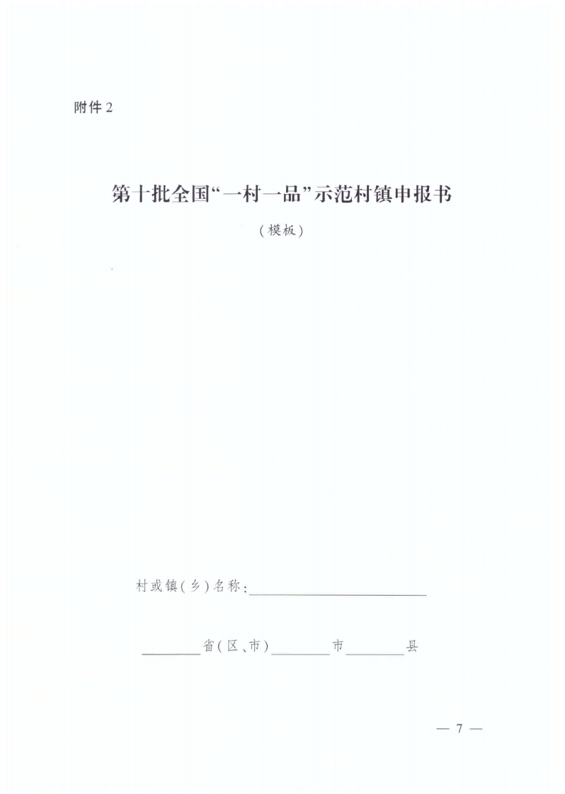 (一)村鎮(zhèn)申報。對照申報條件,填寫《第十批全國“一村一品”示范村鎮(zhèn)申報書》(見附件2),向縣級農(nóng)業(yè)農(nóng)村部門提出申請,并附有關證明材料。