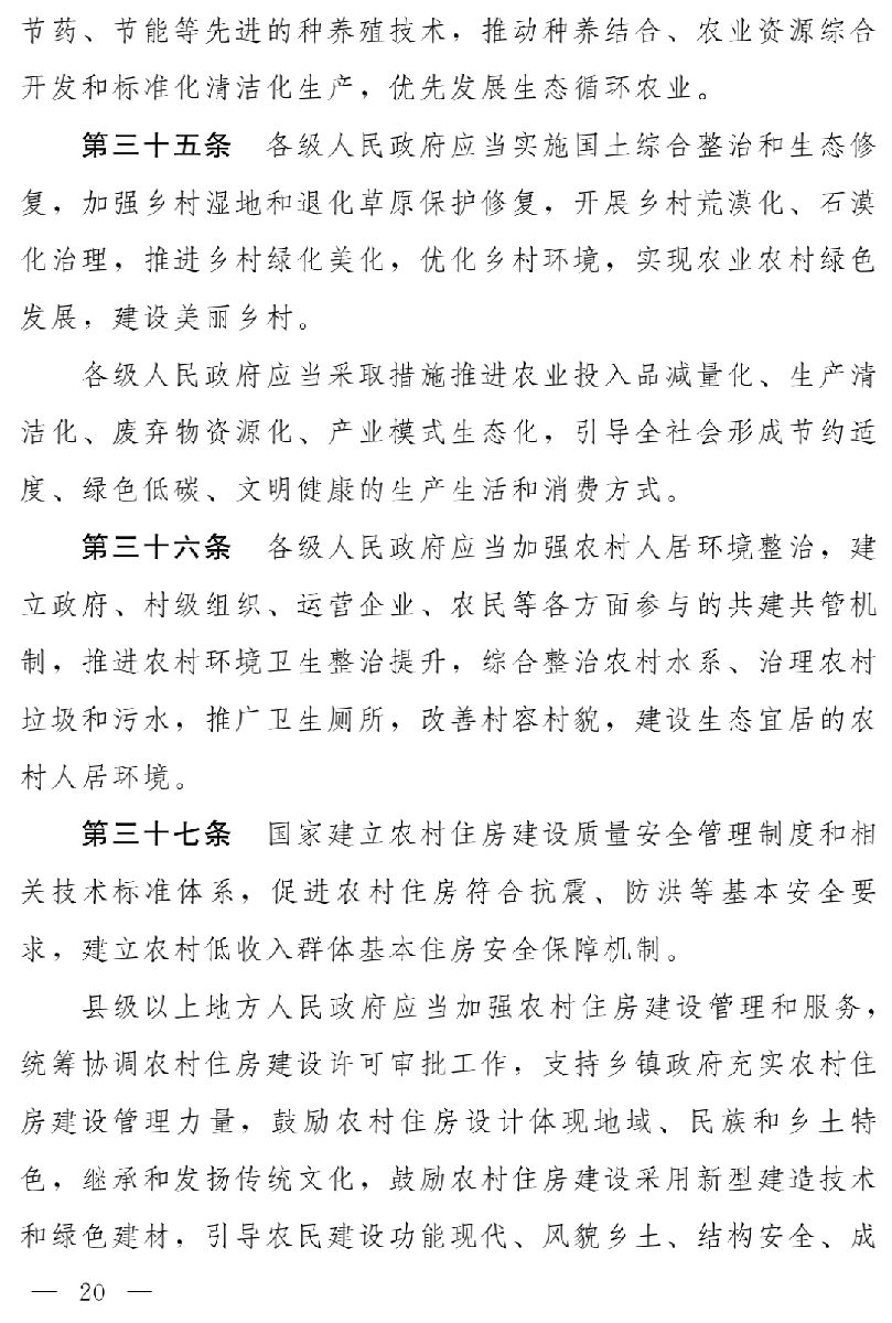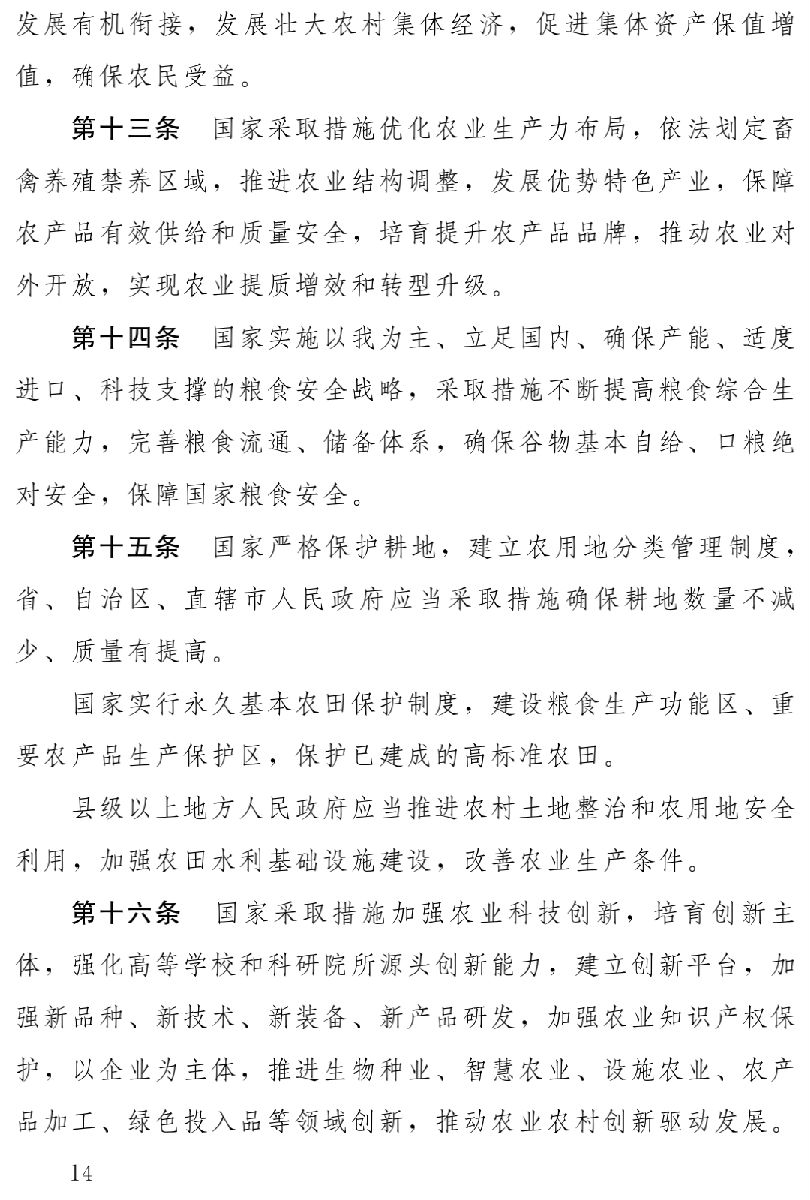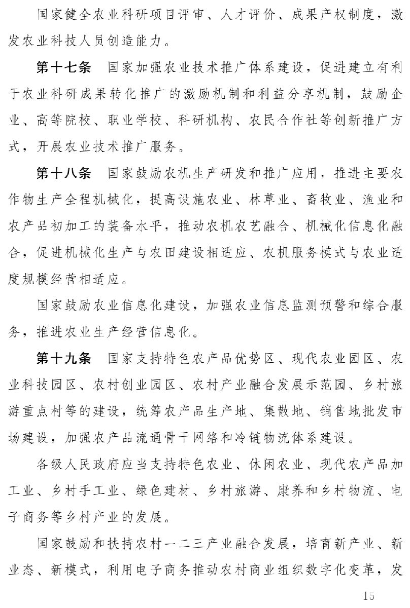 因此,草案第二章至第六章分別以五大振興為主要內(nèi)容,著重從產(chǎn)業(yè)發(fā)展、人才支撐、文化傳承、生態(tài)保護(hù)、組織建設(shè)等方面,將黨中央有關(guān)方針政策和地方實(shí)踐中的成功經(jīng)驗(yàn),通過(guò)立法形式確定下來(lái),明確相關(guān)政策措施,完善相關(guān)制度,保障鄉(xiāng)村全面振興。特別是著重圍繞發(fā)展壯大農(nóng)村集體經(jīng)濟(jì)、培育新型農(nóng)業(yè)經(jīng)營(yíng)主體、促進(jìn)農(nóng)業(yè)轉(zhuǎn)型升級(jí)、不斷提高農(nóng)業(yè)科技水平、嚴(yán)格保護(hù)耕地、保障糧食等主要農(nóng)產(chǎn)品供給、改善鄉(xiāng)村生態(tài)和人居環(huán)境、提高鄉(xiāng)村文明程度和思想道德建設(shè)水平、傳承和發(fā)展中華優(yōu)秀傳統(tǒng)文化、建立健全鄉(xiāng)村社會(huì)治理體系、加強(qiáng)基層組織建設(shè)等方面,作出相應(yīng)規(guī)定。