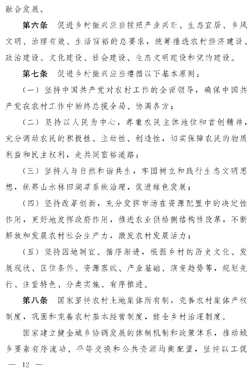 起草工作遵循以下原則:一是堅(jiān)持黨管農(nóng)村工作,毫不動(dòng)搖地堅(jiān)持和加強(qiáng)黨對(duì)農(nóng)村工作的領(lǐng)導(dǎo),確保黨在農(nóng)村工作中始終總攬全局、協(xié)調(diào)各方,為鄉(xiāng)村振興提供堅(jiān)強(qiáng)有力的政治保障;二是堅(jiān)持農(nóng)業(yè)農(nóng)村優(yōu)先發(fā)展,立足于發(fā)揮好鄉(xiāng)村在保障國(guó)家糧食安全和農(nóng)產(chǎn)品供給、保護(hù)生態(tài)和環(huán)境、傳承發(fā)展中華優(yōu)秀傳統(tǒng)文化等方面的獨(dú)特功能,從法律制度上促進(jìn)實(shí)現(xiàn)鄉(xiāng)村全面振興和城鄉(xiāng)融合發(fā)展;三是堅(jiān)持問題導(dǎo)向,著重針對(duì)實(shí)施鄉(xiāng)村振興戰(zhàn)略面臨的薄弱環(huán)節(jié)和突出問題,做好頂層設(shè)計(jì),規(guī)范和健全制度措施、體制機(jī)制和政策體系;四是堅(jiān)持因地制宜、尊重規(guī)律,充分考慮鄉(xiāng)村振興的階段性特征和不同地區(qū)發(fā)展水平的差異,注重法律制度的強(qiáng)制性和規(guī)范性,同時(shí)為分階段、因地制宜推進(jìn)鄉(xiāng)村振興留下空間;五是堅(jiān)持立足國(guó)情,從我國(guó)農(nóng)業(yè)農(nóng)村發(fā)展實(shí)際出發(fā),適當(dāng)參考借鑒境外鄉(xiāng)村振興的有益經(jīng)驗(yàn),建立健全中國(guó)特色鄉(xiāng)村振興法律制度。