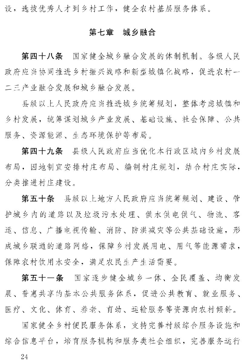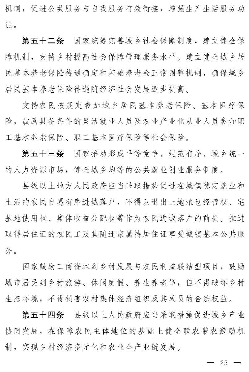 實(shí)施鄉(xiāng)村振興戰(zhàn)略,必須重塑城鄉(xiāng)關(guān)系,走城鄉(xiāng)融合發(fā)展之路。要堅(jiān)持好農(nóng)村基本制度,堅(jiān)守好底線,保護(hù)好農(nóng)民利益,更好激發(fā)農(nóng)村內(nèi)部發(fā)展活力;同時(shí),要著力統(tǒng)籌城鄉(xiāng)基礎(chǔ)設(shè)施建設(shè),促進(jìn)城鄉(xiāng)基本公共服務(wù)均等化,優(yōu)化農(nóng)村外部發(fā)展環(huán)境,縮小城鄉(xiāng)發(fā)展差距。對(duì)此,草案規(guī)定:國(guó)家堅(jiān)持農(nóng)村土地集體所有制,完善農(nóng)村集體產(chǎn)權(quán)制度,鞏固和完善農(nóng)村基本經(jīng)營(yíng)制度,健全鄉(xiāng)村治理制度;建立健全城鄉(xiāng)融合發(fā)展的體制機(jī)制和政策體系,推動(dòng)形成工農(nóng)互促、城鄉(xiāng)互補(bǔ)、全面融合、共同繁榮的新型工農(nóng)城鄉(xiāng)關(guān)系(第八條)。還專設(shè)一章,規(guī)定各級(jí)人民政府應(yīng)當(dāng)協(xié)同推進(jìn)鄉(xiāng)村振興戰(zhàn)略和新型城鎮(zhèn)化戰(zhàn)略,促進(jìn)農(nóng)村一二三產(chǎn)業(yè)融合發(fā)展和城鄉(xiāng)一體化發(fā)展;縣級(jí)以上人民政府應(yīng)當(dāng)推進(jìn)城鄉(xiāng)統(tǒng)一規(guī)劃,因地制宜安排村莊布局,完善城鄉(xiāng)基本公共服務(wù)體系,提高鄉(xiāng)村居民社會(huì)保障水平,推動(dòng)人口、土地、資本等要素在城鄉(xiāng)間有序流動(dòng),采取措施促進(jìn)城鄉(xiāng)產(chǎn)業(yè)協(xié)同發(fā)展,實(shí)現(xiàn)鄉(xiāng)村經(jīng)濟(jì)多元化和農(nóng)業(yè)全產(chǎn)業(yè)鏈發(fā)展,建立健全有利于農(nóng)民收入持續(xù)穩(wěn)定增長(zhǎng)的機(jī)制(第七章)。