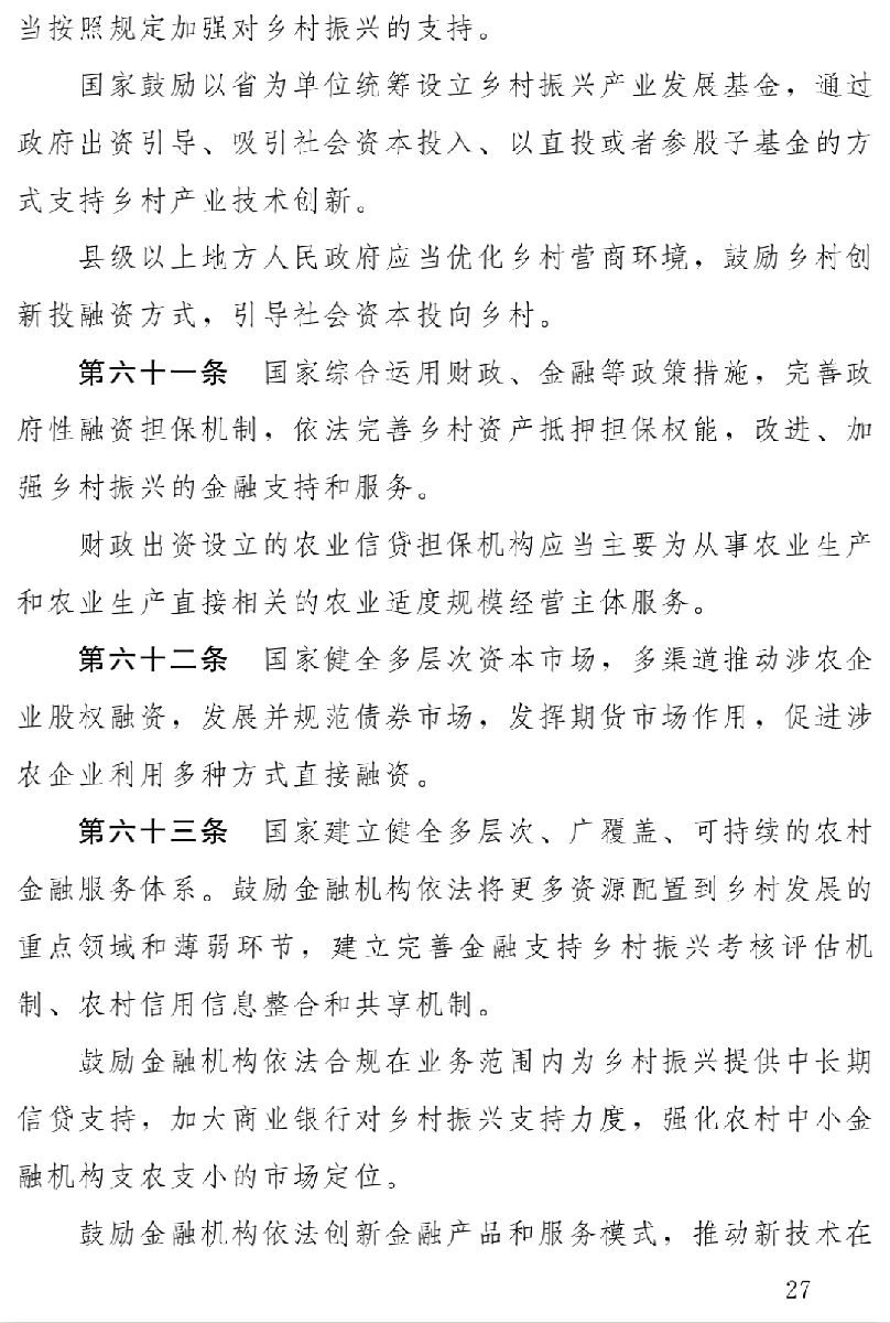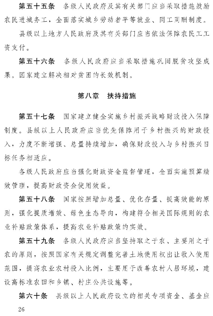 實(shí)施鄉(xiāng)村振興戰(zhàn)略,堅(jiān)持農(nóng)業(yè)農(nóng)村優(yōu)先發(fā)展,必須強(qiáng)化鄉(xiāng)村振興的扶持措施。黨的十八大以來(lái),黨中央持續(xù)加大強(qiáng)農(nóng)惠農(nóng)富農(nóng)政策力度,出臺(tái)了一系列切實(shí)有效的政策措施,有力促進(jìn)了農(nóng)業(yè)農(nóng)村發(fā)展。2018年中央一號(hào)文件明確提出,實(shí)施鄉(xiāng)村振興戰(zhàn)略,必須解決錢從哪里來(lái)的問題,要健全投入保障制度,確保財(cái)政投入持續(xù)增長(zhǎng),拓寬資金籌集渠道,創(chuàng)新投融資機(jī)制,提高金融服務(wù)水平,加快形成財(cái)政優(yōu)先保障、金融重點(diǎn)傾斜、社會(huì)積極參與的多元投入格局,確保投入力度不斷增強(qiáng)、總量持續(xù)增加。為此,草案專設(shè)扶持措施一章,將黨中央強(qiáng)農(nóng)惠農(nóng)富農(nóng)政策上升為法律規(guī)范,分別就財(cái)政投入、農(nóng)業(yè)補(bǔ)貼、土地出讓收入、資金基金、融資擔(dān)保、資本市場(chǎng)、金融服務(wù)、農(nóng)業(yè)保險(xiǎn)、用地保障,以及社會(huì)資本參與鄉(xiāng)村振興等作出規(guī)定,從政策扶持上落實(shí)農(nóng)業(yè)農(nóng)村優(yōu)先發(fā)展。(第八章)