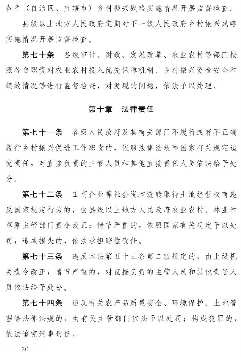 為確保鄉(xiāng)村振興各項(xiàng)工作有效開展,層層壓實(shí)推進(jìn)鄉(xiāng)村振興的責(zé)任,草案設(shè)監(jiān)督檢查一章,多層次、多角度地落實(shí)鄉(xiāng)村振興相關(guān)方面的責(zé)任。草案明確,建立實(shí)施鄉(xiāng)村振興戰(zhàn)略的目標(biāo)責(zé)任制和考核評(píng)價(jià)制度,地方黨委和人民政府承擔(dān)促進(jìn)鄉(xiāng)村振興的主體責(zé)任,縣級(jí)以上地方黨委和人民政府應(yīng)當(dāng)以適當(dāng)方式考核本級(jí)黨委和人民政府相關(guān)部門負(fù)責(zé)人、下級(jí)黨委和人民政府及其負(fù)責(zé)人完成鄉(xiāng)村振興目標(biāo)情況,考核結(jié)果作為有關(guān)領(lǐng)導(dǎo)班子和領(lǐng)導(dǎo)干部綜合考核評(píng)價(jià)的重要內(nèi)容(第六十六條)。草案還規(guī)定,各?。ㄗ灾螀^(qū)、直轄市)黨委和政府每年向黨中央、國(guó)務(wù)院報(bào)告鄉(xiāng)村振興戰(zhàn)略實(shí)施情況,省級(jí)以下各級(jí)黨委和政府每年向上級(jí)黨委和政府報(bào)告鄉(xiāng)村振興戰(zhàn)略實(shí)施情況。國(guó)務(wù)院和縣級(jí)以上地方各級(jí)人民政府應(yīng)當(dāng)向本級(jí)人民代表大會(huì)或者其常務(wù)委員會(huì)報(bào)告鄉(xiāng)村振興促進(jìn)工作進(jìn)展情況。鄉(xiāng)(民族鄉(xiāng)、鎮(zhèn))人民政府應(yīng)當(dāng)向本級(jí)人民代表大會(huì)報(bào)告鄉(xiāng)村振興促進(jìn)工作進(jìn)展情況(第六十八條)。此外,草案還明確了各級(jí)審計(jì)、財(cái)政、發(fā)展改革、農(nóng)業(yè)農(nóng)村等部門以及縣級(jí)以上人民政府的監(jiān)督檢查職責(zé)(第六十九條、第七十條)。
