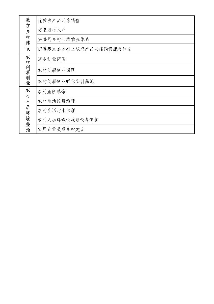 (十一)農(nóng)村創(chuàng)新創(chuàng)業(yè)。鼓勵社會資本投資建設(shè)返鄉(xiāng)創(chuàng)業(yè)園區(qū)、農(nóng)村創(chuàng)新創(chuàng)業(yè)園區(qū)、農(nóng)村創(chuàng)新創(chuàng)業(yè)孵化實訓(xùn)基地等平臺載體,加強(qiáng)各類創(chuàng)新創(chuàng)業(yè)平臺載體的基礎(chǔ)設(shè)施、服務(wù)體系建設(shè),推動產(chǎn)學(xué)研用合作,激發(fā)農(nóng)村創(chuàng)新創(chuàng)業(yè)活力。鼓勵社會資本聯(lián)合普通高校、職業(yè)院校、優(yōu)質(zhì)教育培訓(xùn)機(jī)構(gòu)等開展面向農(nóng)村創(chuàng)新創(chuàng)業(yè)人員的創(chuàng)業(yè)能力、產(chǎn)業(yè)技術(shù)、經(jīng)營管理培訓(xùn),強(qiáng)化鄉(xiāng)村振興人才支撐。