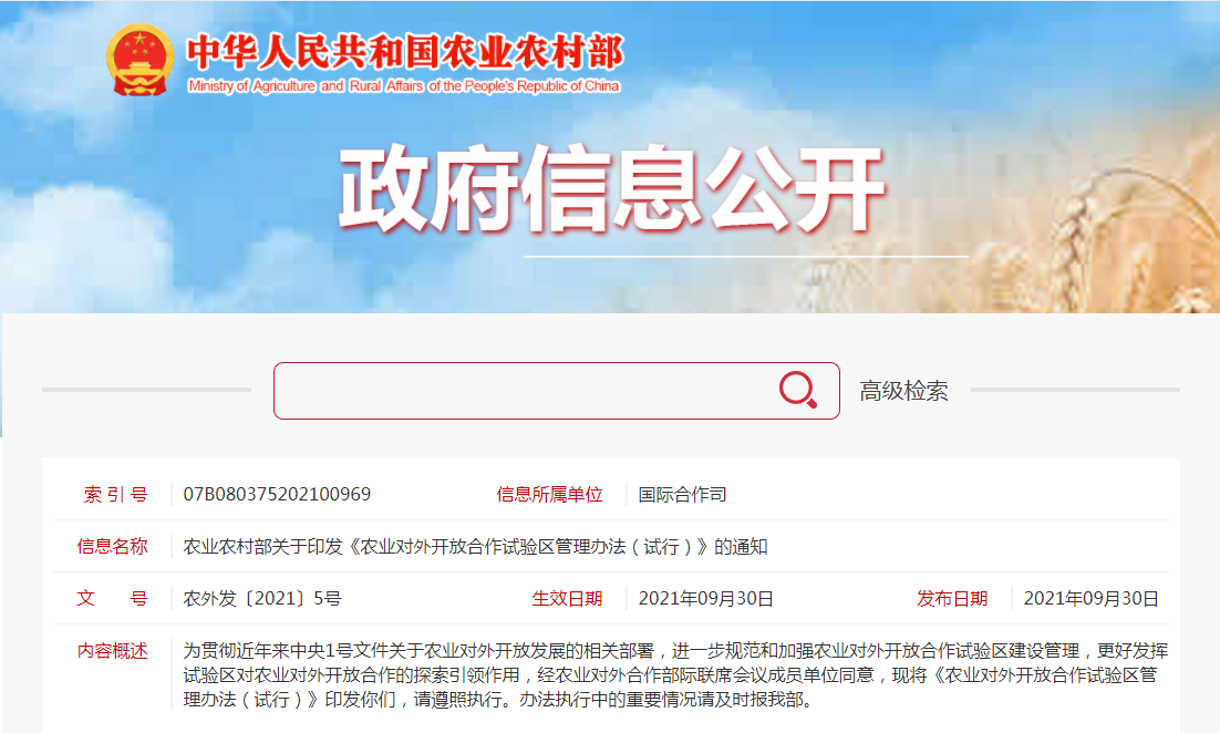 第一章 總則第一條 為進一步規(guī)范和加強農(nóng)業(yè)對外開放合作試驗區(qū)建設(shè)管理,更好發(fā)揮試驗區(qū)對農(nóng)業(yè)對外開放合作的探索引領(lǐng)作用,根據(jù)國家有關(guān)政策、法規(guī)和農(nóng)業(yè)對外合作部際......