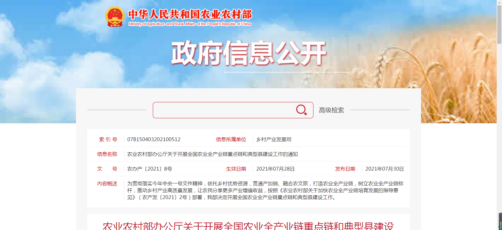各省、自治區(qū)、直轄市農(nóng)業(yè)農(nóng)村(農(nóng)牧)廳(局、委),福建省海洋與漁業(yè)局,新疆生產(chǎn)建設(shè)兵團農(nóng)業(yè)農(nóng)村局: 為貫徹落實今年中央一號文件精神,依托鄉(xiāng)村優(yōu)勢資源,貫通產(chǎn)加......