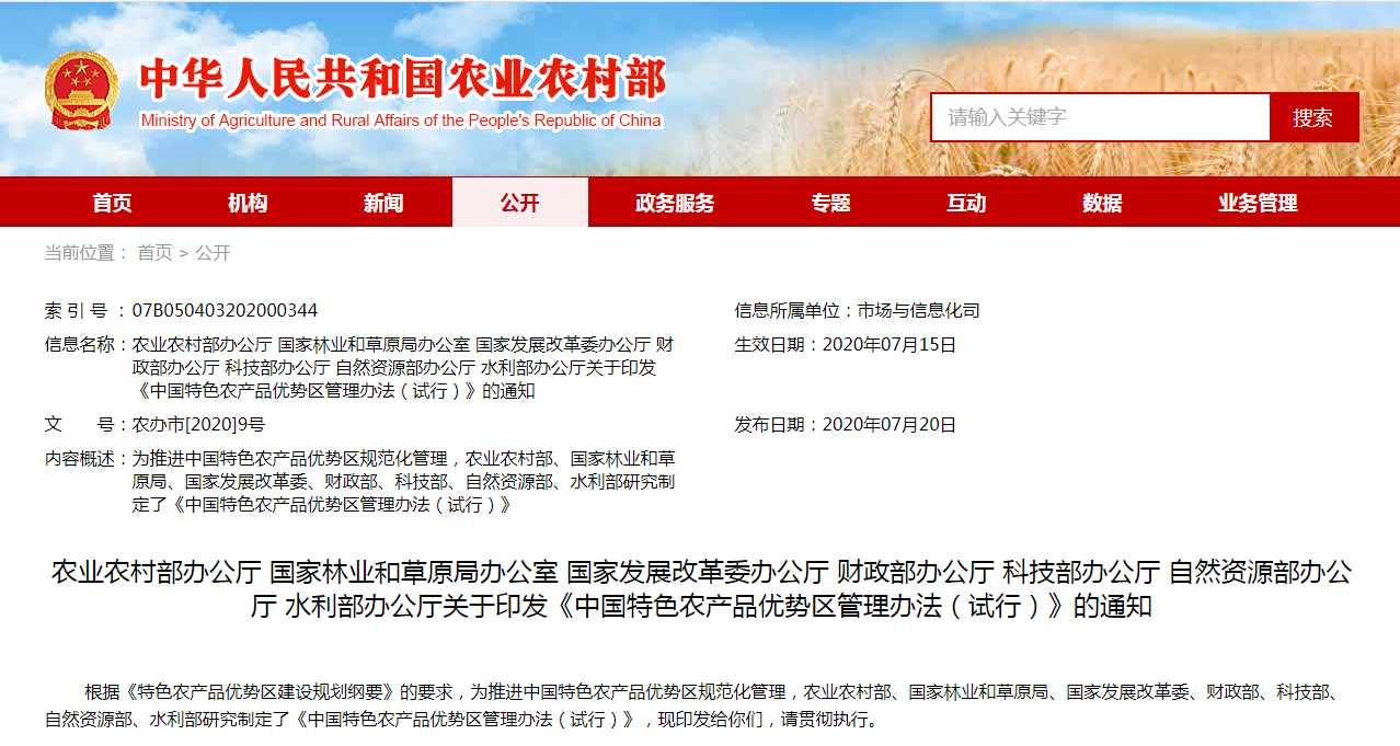 根據(jù)《特色農產品優(yōu)勢區(qū)建設規(guī)劃綱要》的要求,為推進中國特色農產品優(yōu)勢區(qū)規(guī)范化管理,農業(yè)農村部、國家林業(yè)和草原局、國家發(fā)展改革委、財政部、科技部、自然資源部、水利......