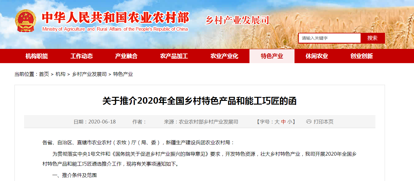 6月18日,農業(yè)農村部向各地發(fā)出《關于推介2020年全國鄉(xiāng)村特色產品和能工巧匠的函》。...