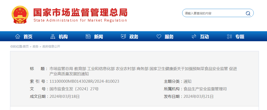各省、自治區(qū)、直轄市和新疆生產(chǎn)建設(shè)兵團(tuán)市場監(jiān)管局(廳、委)、教育、工業(yè)和信息化、農(nóng)業(yè)農(nóng)村、商務(wù)、衛(wèi)生健康主管部門:為貫徹落實(shí)黨中央、國務(wù)院關(guān)于培育發(fā)展預(yù)制菜產(chǎn)業(yè)......