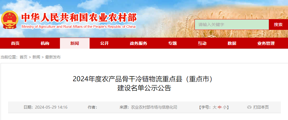 為落實(shí)《中華人民共和國國民經(jīng)濟(jì)和社會(huì)發(fā)展第十四個(gè)五年規(guī)劃和2035年遠(yuǎn)景目標(biāo)綱要》有關(guān)部署,我部組織完成了2024年度農(nóng)產(chǎn)品骨干冷鏈物流重點(diǎn)縣(重點(diǎn)市)綜合把關(guān)......