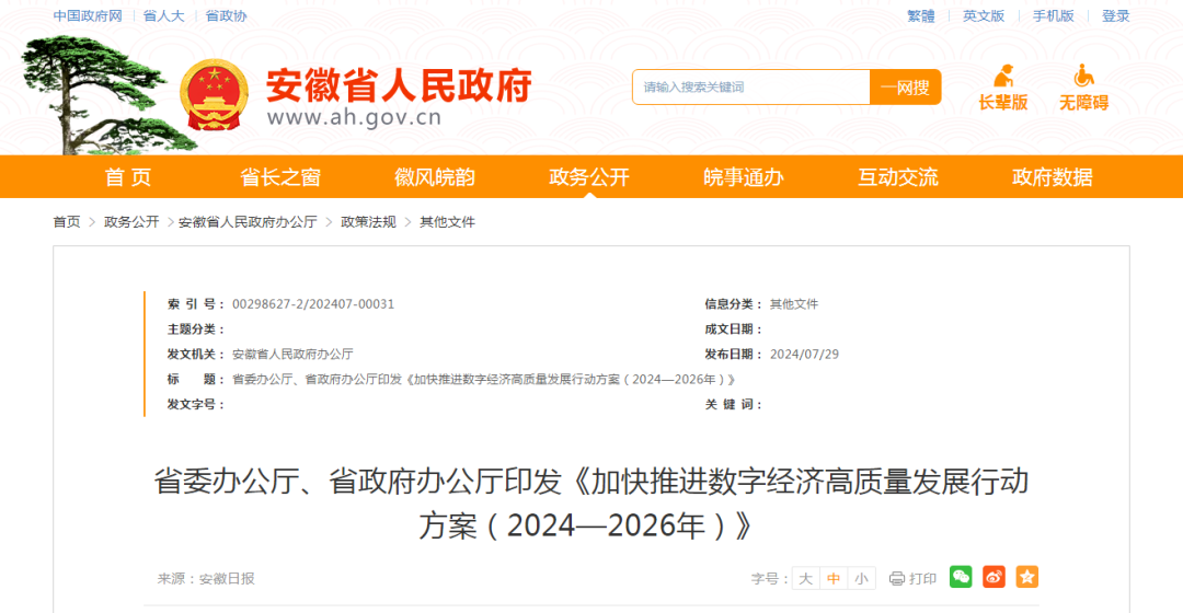 近期,中共安徽省委辦公廳、安徽省人民政府辦公廳印發(fā)了《加快推進數(shù)字經(jīng)濟高質(zhì)量發(fā)展行動方案(2024-2026年)》,并發(fā)出通知,要求各地各部門結合實際認真貫徹落......