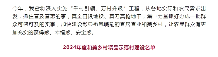 2024年度安徽省和美鄉(xiāng)村省級中心村建設(shè)名單已印發(fā),共有850個中心村入選,建設(shè)周期18個月。加快建設(shè)彰顯徽風(fēng)皖韻的宜居宜業(yè)和美鄉(xiāng)村,是推進(jìn)安徽農(nóng)業(yè)農(nóng)村現(xiàn)代化的......