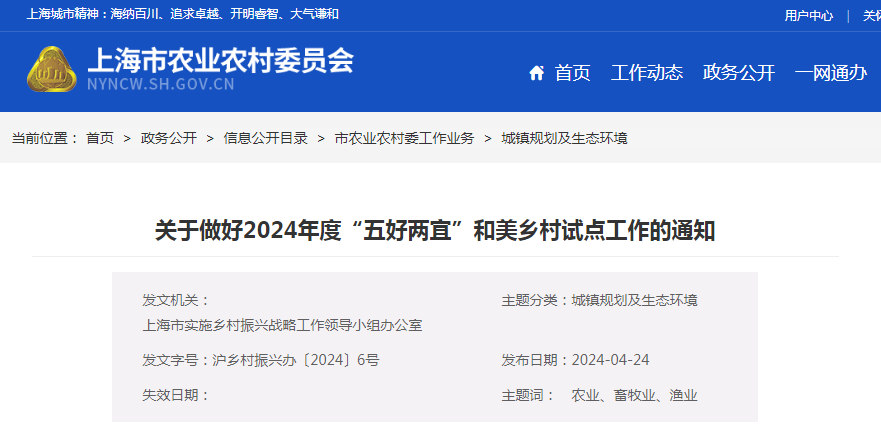 相關(guān)涉農(nóng)區(qū)實施鄉(xiāng)村振興戰(zhàn)略工作領(lǐng)導(dǎo)小組辦公室:按照《關(guān)于印發(fā)〈上海市2024年“五好兩宜”和美鄉(xiāng)村試點工作方案〉的通知》(滬農(nóng)委〔2023〕408號)工作要求,......