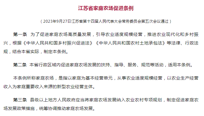 第一條 為了促進家庭農場高質量發(fā)展,引導農業(yè)適度規(guī)模經營,推進農業(yè)現(xiàn)代化和鄉(xiāng)村振興,根據(jù)《中華人民共和國鄉(xiāng)村振興促進法》《中華人民共和國農村土地承包法》等法律......