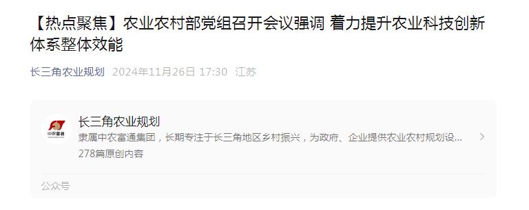 11月25日,農(nóng)業(yè)農(nóng)村部黨組書(shū)記、部長(zhǎng)韓俊主持召開(kāi)部黨組會(huì)議,審議并原則通過(guò)《關(guān)于加快提升農(nóng)業(yè)科技創(chuàng)新體系整體效能的實(shí)施意見(jiàn)》。會(huì)議強(qiáng)調(diào),要深入學(xué)習(xí)貫徹習(xí)近平總......