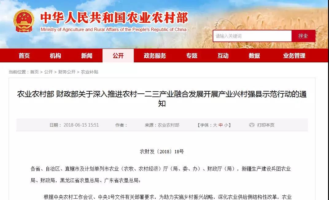 日前,農(nóng)業(yè)農(nóng)村部和財(cái)政部發(fā)布了關(guān)于深入推進(jìn)農(nóng)村一二三產(chǎn)業(yè)融合發(fā)展開展產(chǎn)業(yè)興村強(qiáng)縣示范行動(dòng)的通知。...