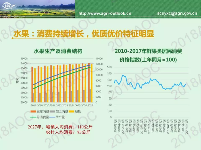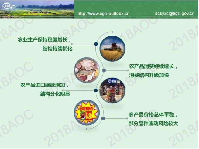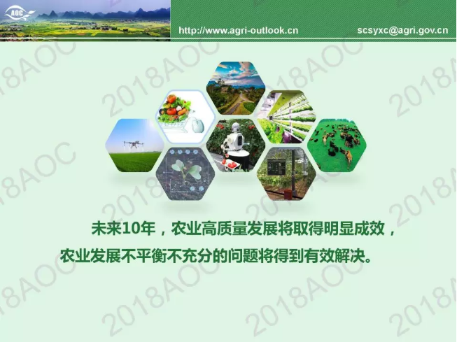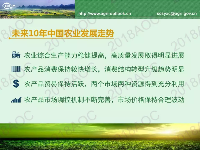 價(jià)格方面,稻谷、小麥價(jià)格展望前期穩(wěn)中趨弱,鮮活品種價(jià)格季節(jié)性波動(dòng)仍然明顯。展望后期,受成本推動(dòng)和經(jīng)濟(jì)增長(zhǎng)等因素影響,農(nóng)產(chǎn)品價(jià)格穩(wěn)中趨漲。針對(duì)18個(gè)品種的未來(lái)10年走勢(shì)進(jìn)行了專題信息發(fā)布。