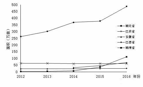 圖2 2012-2016年五個(gè)主產(chǎn)省養(yǎng)殖面積變化情況