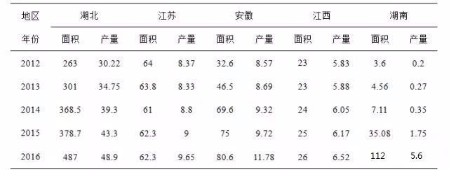 表1 2012-2016年五個(gè)主產(chǎn)省份小龍蝦養(yǎng)殖面積和產(chǎn)量情況 單位:萬(wàn)畝/萬(wàn)噸