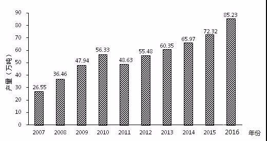 圖一 2007-2016年全國(guó)小龍蝦養(yǎng)殖產(chǎn)量變化情況