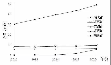 圖3 2012-2016年五個(gè)主產(chǎn)省養(yǎng)殖產(chǎn)量變化情況