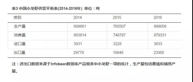 表3 中國(guó)小龍蝦供需平衡表(2014-2016年)單位:噸