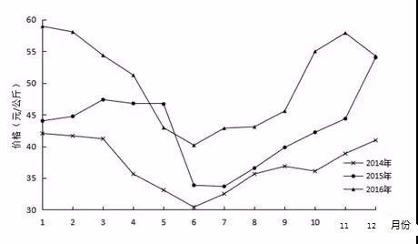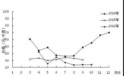 小龍蝦的生產(chǎn)供給季節(jié)性特征明顯,市場(chǎng)價(jià)格隨上市供給量變化而波動(dòng)。根據(jù)2014-2016年小龍蝦批發(fā)價(jià)格和出塘價(jià)格看。近三年小龍蝦價(jià)格逐年提高,價(jià)格呈季節(jié)性波動(dòng),每年的6-7月上市旺季期間價(jià)格最低,春冬季上市淡季期間價(jià)格走向峰值。