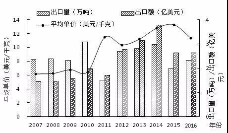 圖8 2007-2016年全國(guó)小龍蝦出口情況