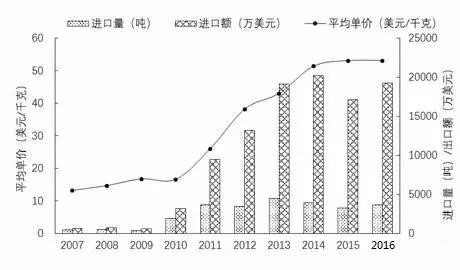 圖9 2007-2016年全國(guó)小龍蝦進(jìn)口情況