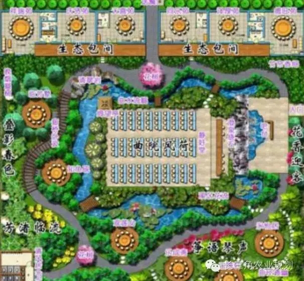 生態(tài)餐廳的園林布景發(fā)揮空間大,可隨意設(shè)計,需要結(jié)合生態(tài)餐廳的餐飲功能進(jìn)行功能分區(qū)。一般而言,生態(tài)餐廳有迎賓接待區(qū)(入口大廳)、觀賞區(qū)、點(diǎn)菜區(qū)、就餐區(qū)、后廚區(qū)、收銀區(qū)、有的還要根據(jù)當(dāng)?shù)仫L(fēng)俗民情設(shè)置宴會大廳及舞臺表演區(qū)的功能區(qū)。