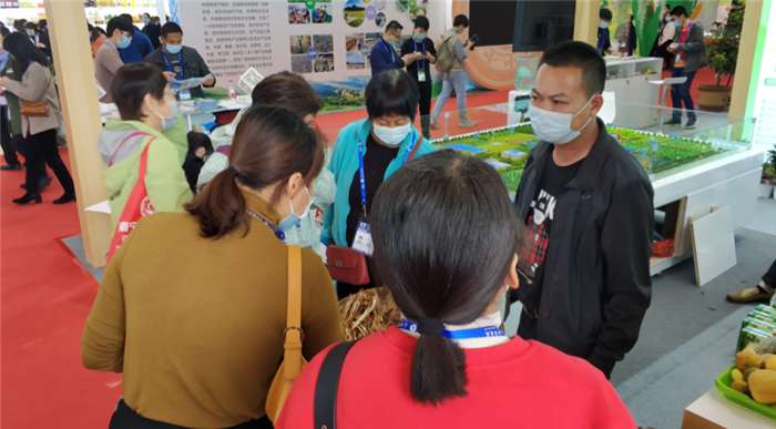 ▲廣西貿(mào)促會(huì)會(huì)長(zhǎng)李常官蒞臨展位參觀,廣西中農(nóng)富玉國(guó)際農(nóng)業(yè)科技有限公司總經(jīng)理韓雪松陪同