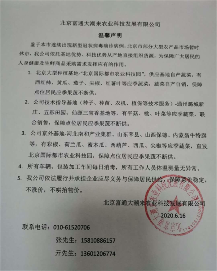 ▼在北京農產品市突發(fā)疫情后,北京富通大潮來農業(yè)科技發(fā)展有限公司(簡稱 富通大潮來)依托基地優(yōu)勢、科技優(yōu)勢從產地直接組織貨源,為保障廣大居民的人身健康及生鮮商品采購需求發(fā)揮應有的作用。應對非常時期民生需求,全力以赴穩(wěn)價格、保供應。富通大潮來從基地點對點對接 70 余個社區(qū),疫情期間,減少污染接觸環(huán)節(jié),保證市民菜價。