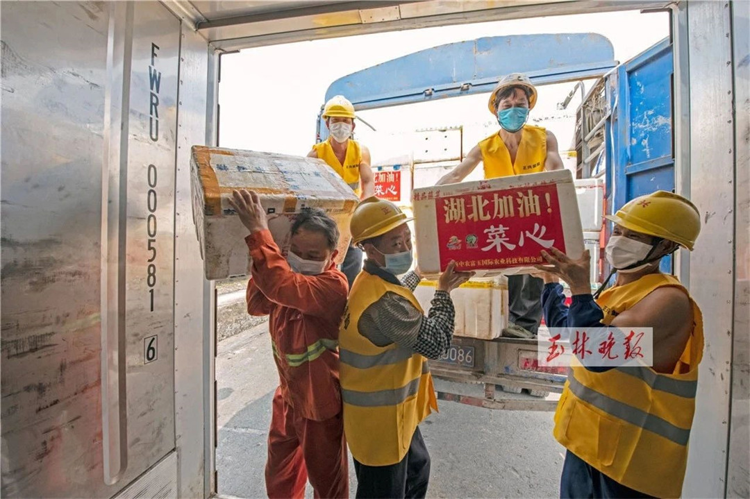 ▼3月9日上午,兩輛裝滿支援湖北果蔬的貨車從五彩田園中農(nóng)富玉基地發(fā)車,駛向玉林火車站“廣西(玉林市)支援湖北果蔬物資冷鏈專列”。車上載滿了廣西中農(nóng)富玉國際農(nóng)業(yè)科技有限公司(以下簡稱中農(nóng)富玉)及中農(nóng)富玉聯(lián)合本地的愛心企業(yè)、合作社捐贈的優(yōu)質(zhì)農(nóng)產(chǎn)品。