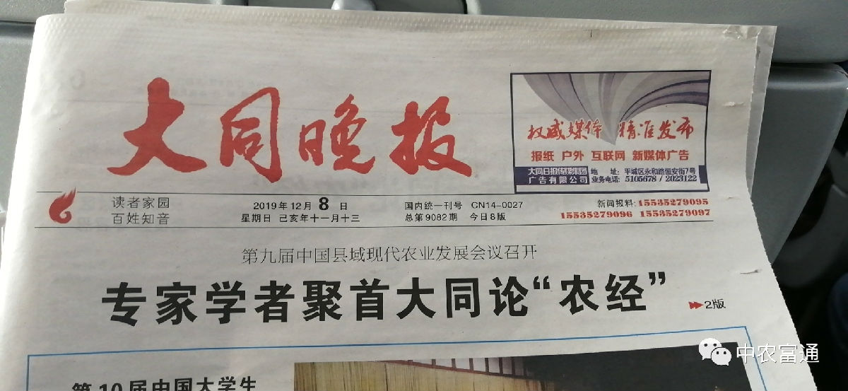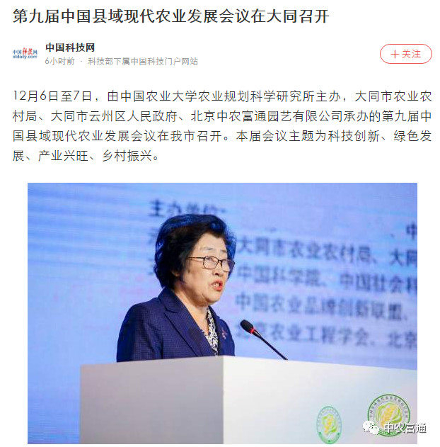 ▼12月6日-7日,第九屆中國(guó)縣域現(xiàn)代農(nóng)業(yè)發(fā)展會(huì)議在國(guó)家歷史文化名城——山西大同成功舉辦。本次會(huì)議由中國(guó)農(nóng)業(yè)大學(xué)農(nóng)業(yè)規(guī)劃科學(xué)研究所主辦,大同市農(nóng)業(yè)農(nóng)村局、大同市云州區(qū)人民政府、北京中農(nóng)富通園藝有限公司承辦,會(huì)議主題為“科技創(chuàng)新、綠色發(fā)展、產(chǎn)業(yè)興旺、鄉(xiāng)村振興”。來(lái)自國(guó)內(nèi)外農(nóng)業(yè)科研院校的專(zhuān)家教授、各地主管農(nóng)業(yè)的領(lǐng)導(dǎo)、農(nóng)業(yè)重點(diǎn)園區(qū)的主管領(lǐng)導(dǎo)、國(guó)家級(jí)農(nóng)業(yè)產(chǎn)業(yè)化企業(yè)、國(guó)內(nèi)外知名涉農(nóng)企業(yè)負(fù)責(zé)人等共700余人參加會(huì)議,6日線(xiàn)上直播觀(guān)看人數(shù)高達(dá)1.17萬(wàn)人。會(huì)議同期舉辦了七場(chǎng)專(zhuān)題研討會(huì)、慶祝新中國(guó)成立70周年·2019鄉(xiāng)村振興優(yōu)秀案例展、縣域現(xiàn)代農(nóng)業(yè)發(fā)展論文征集、名稀特優(yōu)農(nóng)產(chǎn)品展示等。本次會(huì)議受到與會(huì)嘉賓高度稱(chēng)贊,取得圓滿(mǎn)成功,中國(guó)網(wǎng)、中國(guó)科技網(wǎng)、大同日?qǐng)?bào)、大同晚報(bào)等多家媒體紛紛給予報(bào)道。