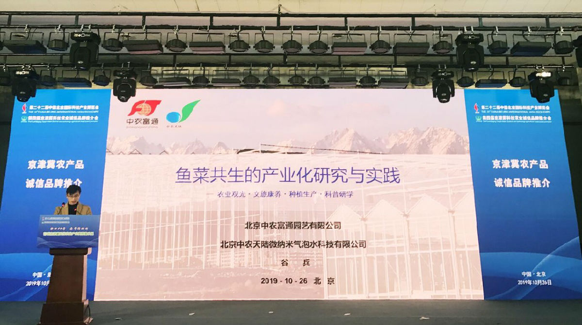 ▼10月26日,北京中農(nóng)天陸微納米氣泡水科技有限公司應(yīng)邀參加以“壯麗70年·奮斗新時(shí)代-引領(lǐng)京津冀科技農(nóng)業(yè)產(chǎn)業(yè)高質(zhì)量發(fā)展”為主題的第二十二屆中國(guó)北京國(guó)際科技產(chǎn)業(yè)博覽會(huì)-第四屆京津冀科技農(nóng)業(yè)誠(chéng)信品牌推介會(huì)。中農(nóng)天陸研發(fā)部水產(chǎn)工程師谷兵代表公司進(jìn)行“魚(yú)菜共生產(chǎn)業(yè)化研究與實(shí)踐”項(xiàng)目推介,受到高度關(guān)注。